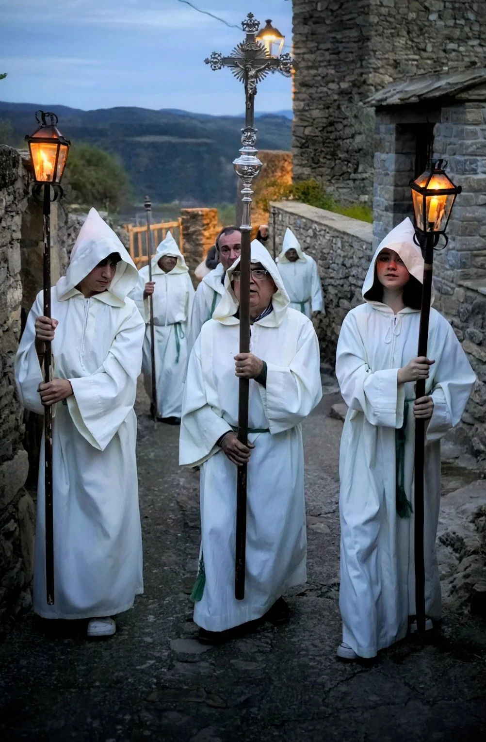 La procesión del Viernes Santo es, sin duda, el momento más emblemático. A diferencia de otras localidades, aquí el recogimiento se mezcla con una atmósfera casi íntima, donde el silencio cobra un protagonismo absoluto. Los habitantes de Roda de Isábena vestidos todos ellos con hábitos y capuchas, portando unos pasos pequeñitos, recorren el casco antiguo en un ambiente solemne, iluminados únicamente por la tenue luz de las velas y de la luna llena. Este detalle, aparentemente sencillo, transforma la experiencia en algo profundamente sobrecogedor.